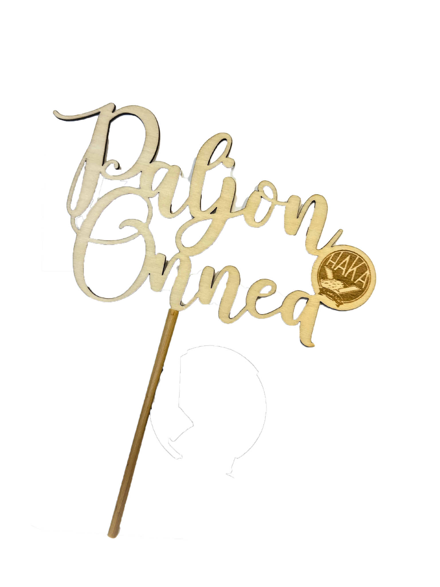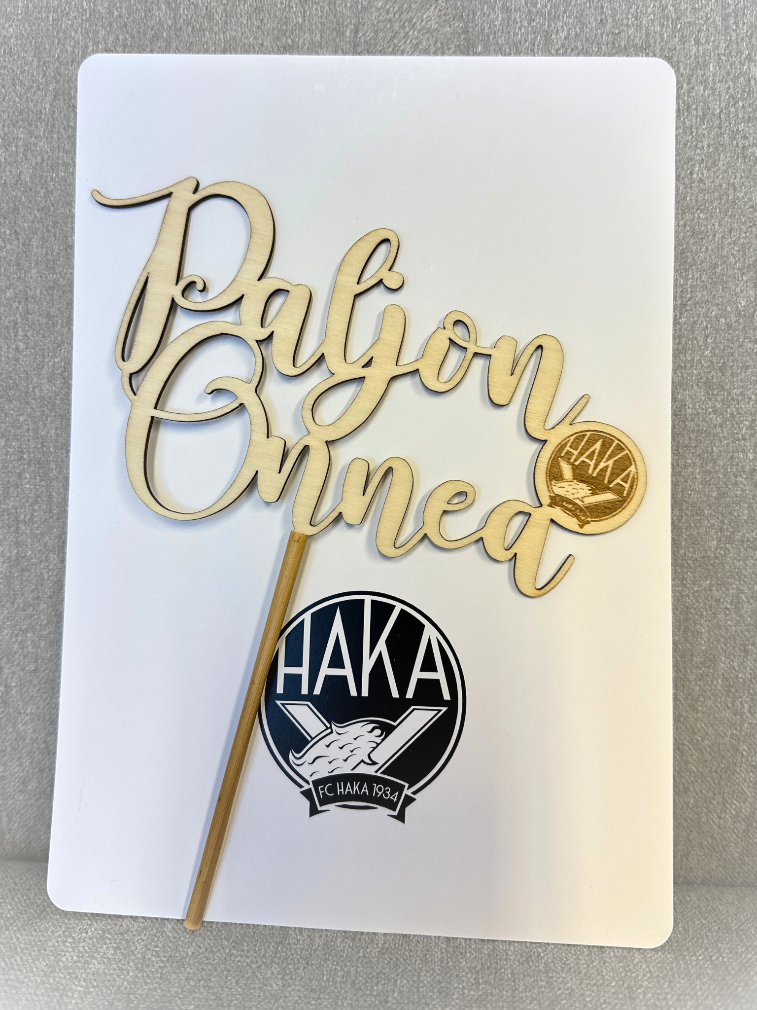Uniikit käsintyönä valmistetut kakkukoristeet Paljon onnea -tekstillä sekä pienellä Hakan logolla.