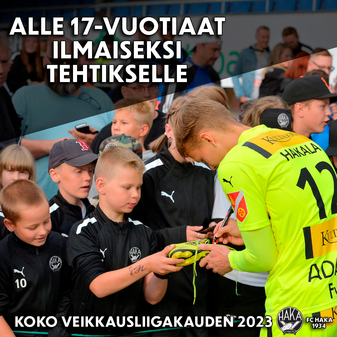 Alle 17-vuotiaiden ilmainen sisäänpääsy on voimassa FC Hakan Veikkausliigan kotiotteluissa 2023. Ei koske euro-, tai Cup-otteluita.