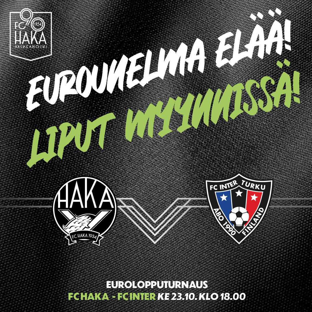 FC Haka jatkaa taisteluaan paikasta Euroopan kentille, kun joukkue isännöi FC Interiä Veikkausliigan Eurolopputurnauksen ratkaisevassa 1.kierroksen ottelussa ylihuomenna keskiviikkona 23. lokakuuta. . Ottelu pelataan Tehtaan kentällä Valkeakoskella klo 18:00. Huomaathan, että Tehtiksen portit aukeavat klo 17.00.