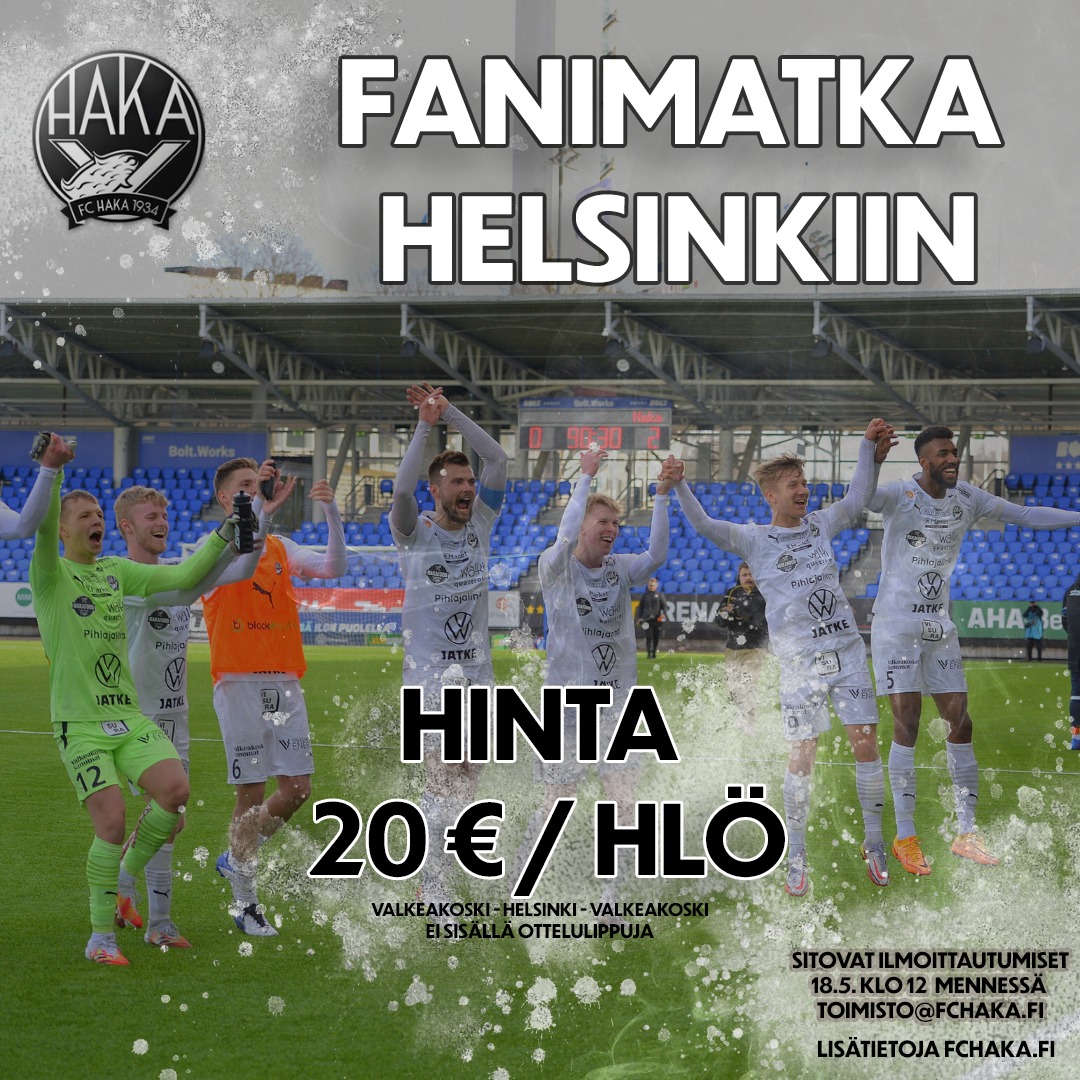 Sunnuntaina 22.5. klo 18.30 Bolt Arenalla pelataan HJK – FC Haka -ottelu. Haka järjestää kyseiseen otteluun bussikyydityksen Helsinkiin ja takaisin Valkeakoskelle.