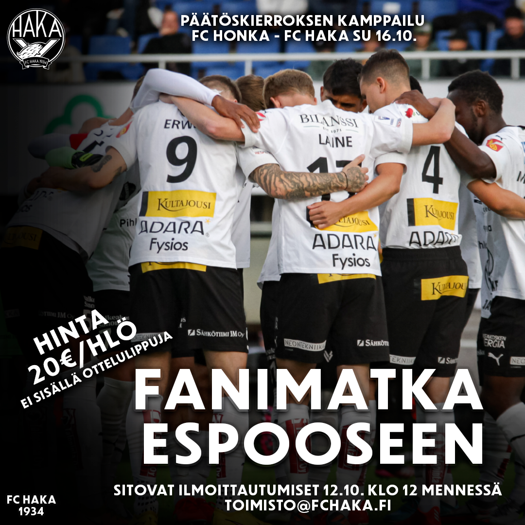 FC Haka järjestää fanimatkan Veikkausliigan päätöskierroksen kamppailuun FC Honka – FC Haka sunnuntaina 16.10. Tapiolan Urheilupuistossa pelattava ottelu alkaa klo 17.00.