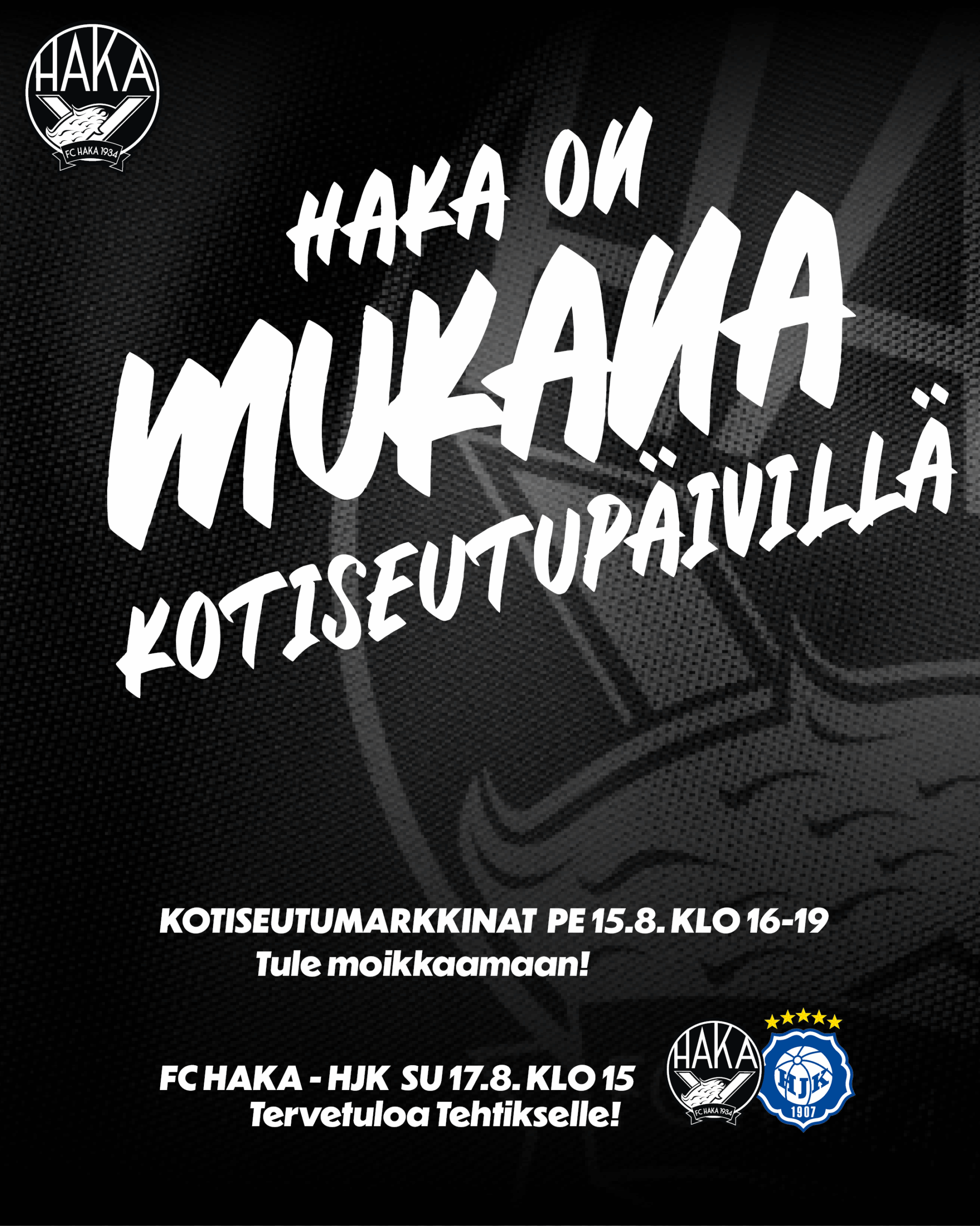 FC Haka on mukana pe 15.8. klo 16-19 Kotiseutumarkkinoilla Valkeakosken Lepänkorvan puistossa. Hakan markkinapisteellä on FC Hakan pelaajia, arvontaa, lipunmyyntiä sekä fanituotteita!