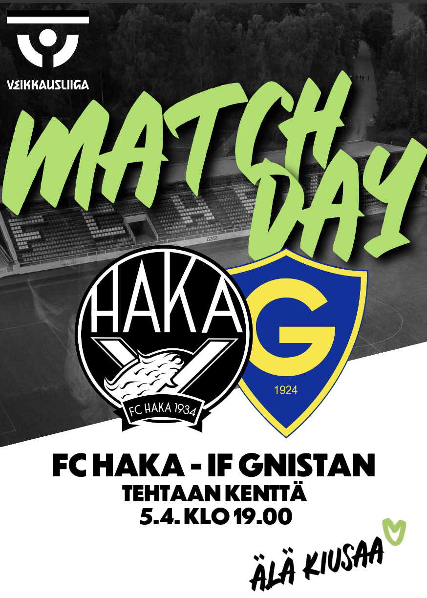 FC Haka – IF Gnistan lauantaina 5.4.2025 kello 19.00 Tehtaan kentällä. Otteluesite digitaalisena täältä.