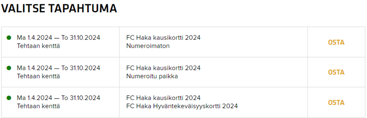 Kausikortit ovat myynnissä osoitteessa www.tiketti.fi/fchaka. Kausikortteja voi ostaa myös FC Hakan toimistolta.