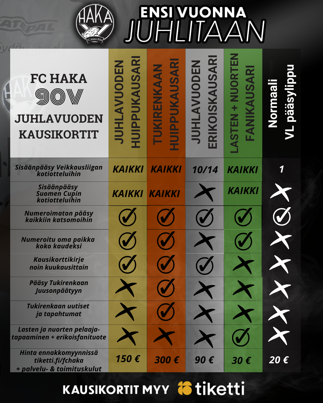 FC Hakan 90. juhlavuoden kausikortit ovat myynnissä NYT! Jouluun 2023 saakka ovat voimassa tarjoushinnat FC Hakan 90-vuotisjuhlakauden kausikorteista. Kausikortit voit ostaa heti (toisin kuin useana vuotena toteutettu haastekampanja, jossa varauksia on kerätty tietty määrä ennen varsinaista ostoa).