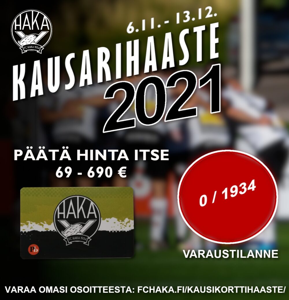 Vuosien nousujohteisella polulla oleva Haka tavoittelee Veikkausliigassa paikkaa kuuden joukkoon ja pyrkii pikku hiljaa vakiinnuttamaan paikkansa Suomen jalkapallon huipulla. Pieneltä haastajapaikkakunnalta tähän tavoitteeseen yltäminen vaatii vahvan kannattajakunnan, ja kausikorttihaaste on jälleen oiva paikka laajalle Haka-yhteisölle niin Suomessa, kuin ulkomaillakin näyttää vahvuutensa.