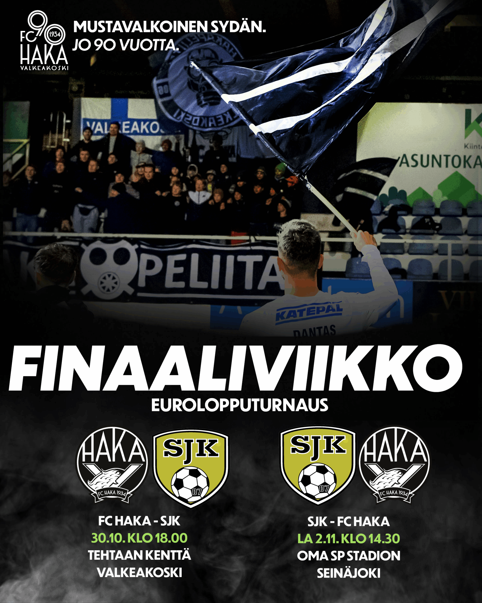 Finaaliviikko on täällä! Kauden viimeiset, ja tärkeimmät matsit ovat täällä. FC Haka on edennyt huikeasti eurolopputurnauksessa finaaliin, jossa vastaan asettuu Veikkausliigassa neljänneksi sijoittunut SJK. Kaksiosaisen finaalin voittaja pelaa ensi kaudella europelejä, päästessään mukaan UEFAn Konferenssiliigan karsintavaiheeseen.