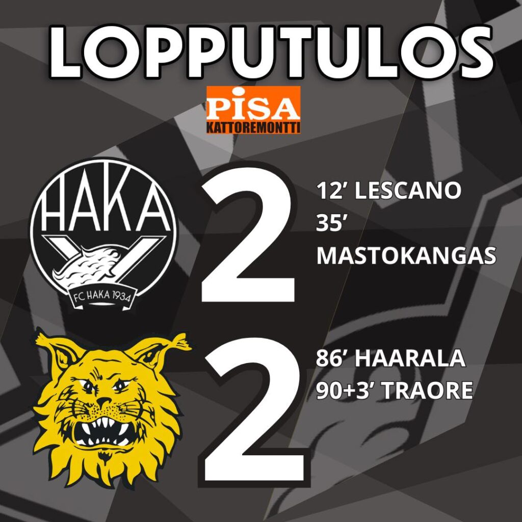 Vieraiden tasoitusmaali nähtiin lisäajalla. Ex-Haka Aapo Mäenpää lähetti keskityksen koko lailla samalta paikalta, kuin Friberg ensimmäisellä jaksolla. Pallo tuli boksin sisään, Mery Traore otti sen reidellä vastaan ja pääsi laukomaan pallon ilmasta vasempaan alanurkkaan.
