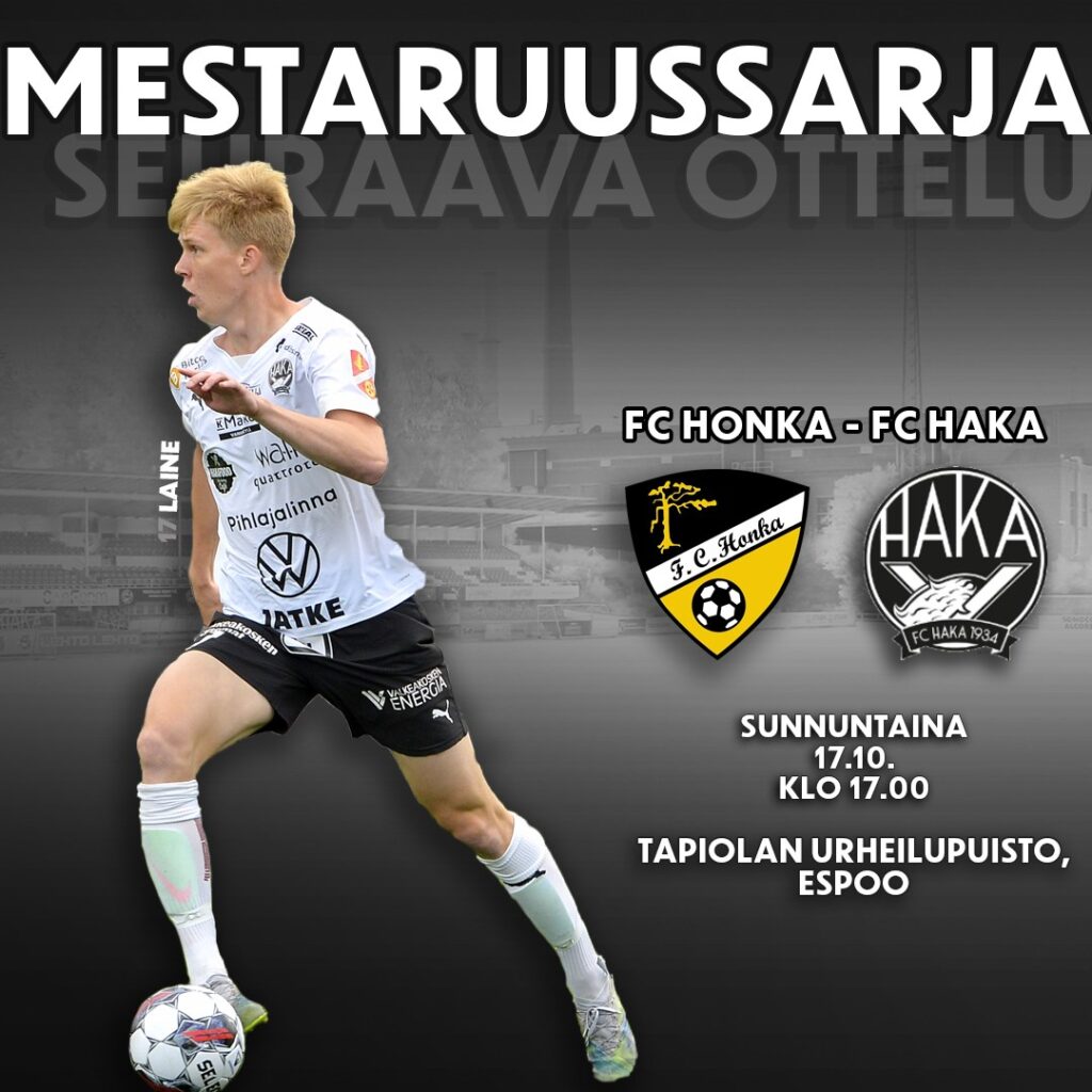 FC Honka – FC Haka pyörähtää käyntiin sunnuntaina 16.10. kello 17.00 Tapiolan urheilupuistossa, Espoossa.