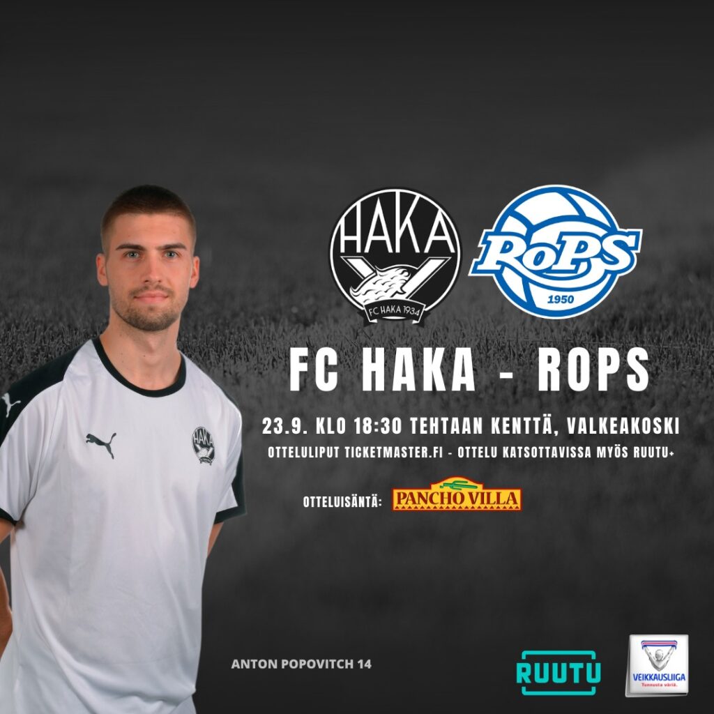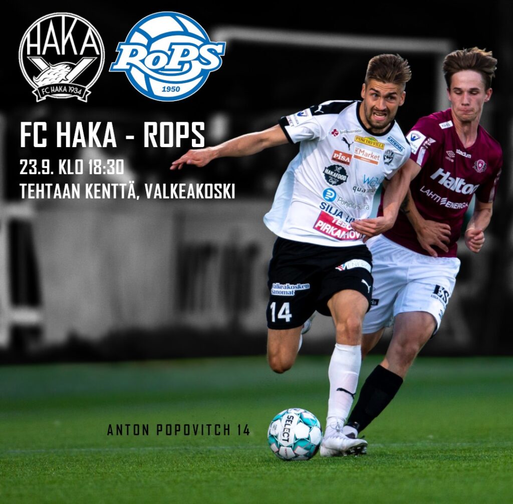 FC Haka – RoPS kello 18.30 Tehtaankentällä – ellet pääse paikalle, niin voit seurata ottelun Ruutu+ -palvelusta.