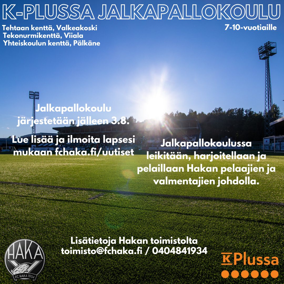 K-Plussa ja FC Haka järjestävät yhteistyössä ilmaisen jalkapallokoulun alueen 7-10-vuotiaille lapsille. Jalkapallokoulussa leikitään, harjoitellaan ja pelaillaan Hakan pelaajien ja valmentajien johdolla. Tervetulleita ovat kaikki kiinnostuneet 7-10-vuotiaat. Jalkapallokoulu järjestetään samaan aikaan TI 3.8. klo 10-13 Valkeakoskella (Tehtaan kenttä), Pälkäneellä (Yhteiskoulun kenttä, 7-12-vuotiaat) ja Viialassa (tekonurmikenttä). Lisäksi kaikki osallistuneet huoltajansa kanssa kutsutaan su 8.8. klo 16.00 FC Haka – FC Inter -otteluun Tehtaan kentälle Valkeakoskelle.