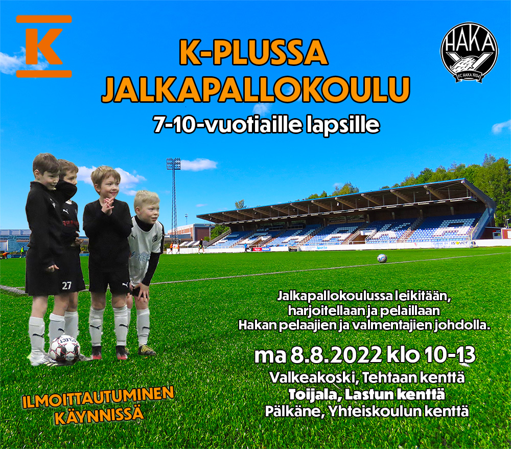 K-Plussa ja FC Haka järjestävät yhteistyössä ilmaisen jalkapallokoulun alueen 7-10-vuotiaille lapsille. Jalkapallokoulussa leikitään, harjoitellaan ja pelaillaan Hakan pelaajien ja valmentajien johdolla. Tervetulleita ovat kaikki kiinnostuneet 7-10-vuotiaat. Jalkapallokoulu järjestetään samanaikaisesti ma 8.8.2022 klo 10-13 Valkeakoskella Tehtaan kentällä, Toijalassa vanhalla Lastun kentällä, nyk. tekonurmikentällä (HUOM: paikka vaihtunut) ja Pälkäneellä Yhteiskoulun kentällä.