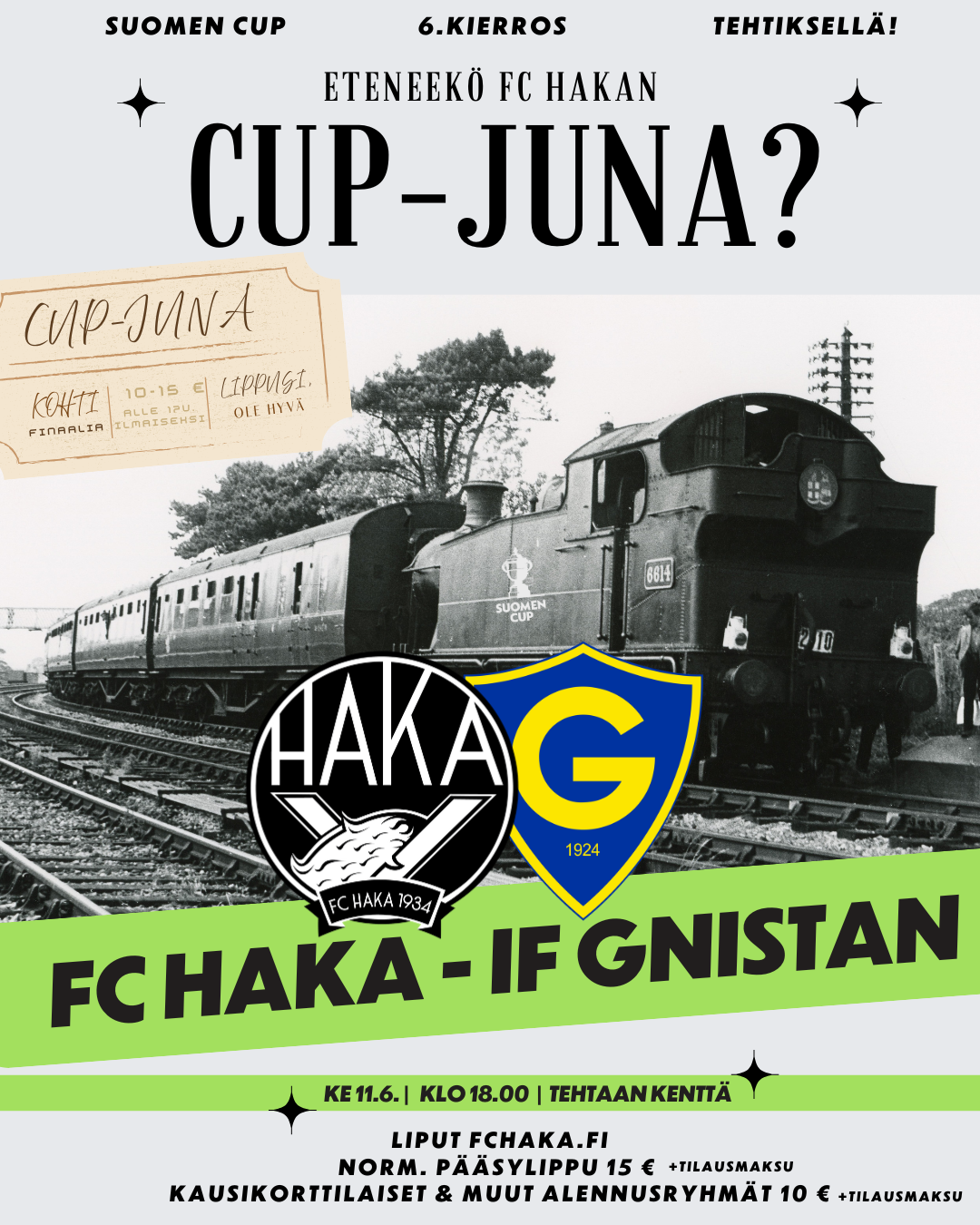 FC Hakan ja IF Gnistanin välinen ottelu pelataan Tehtaan kentällä keskiviikkona 11.6. kello 18.00. Jatkaako Cup-juna seuraavalle asemalle?