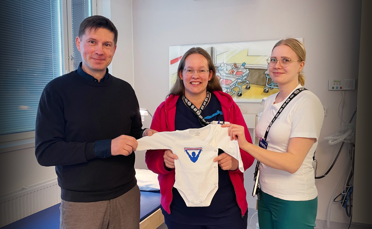 Kuvassa vasemmalla Veikkausliigan toimitusjohtaja Timo Marjamaa luovuttamassa bodyja Naistenklinikalle Helsingissä ja vastaanottamassa keskellä kätilö ja apulaisosastonhoitaja Marjo Lyyra ja oikealla kätilö Minttu Tolvanen.