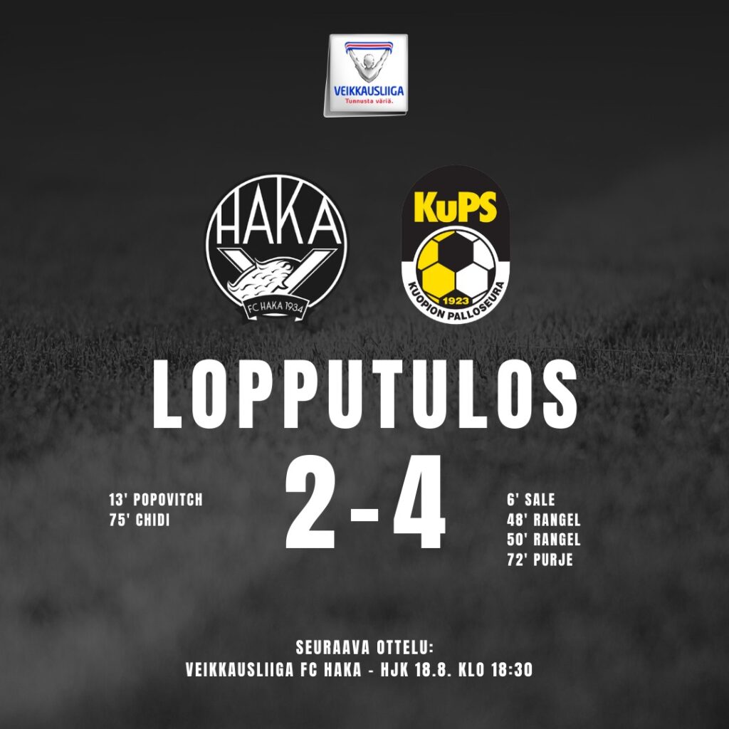 Kahden maalittoman ottelun jälkeen Haka onnistui kotikentällään iskemään kaksi maalia Kuopion Palloseuran verkkoon, mutta siihen ilonaiheet jäivätkin. Vierasjoukkue rankaisi virheistä armotta ja iski pallon tuplaten Hakan maaliin, joten täydet kolme pistettä lähti Kuopioon 2-4 -tuloksella.