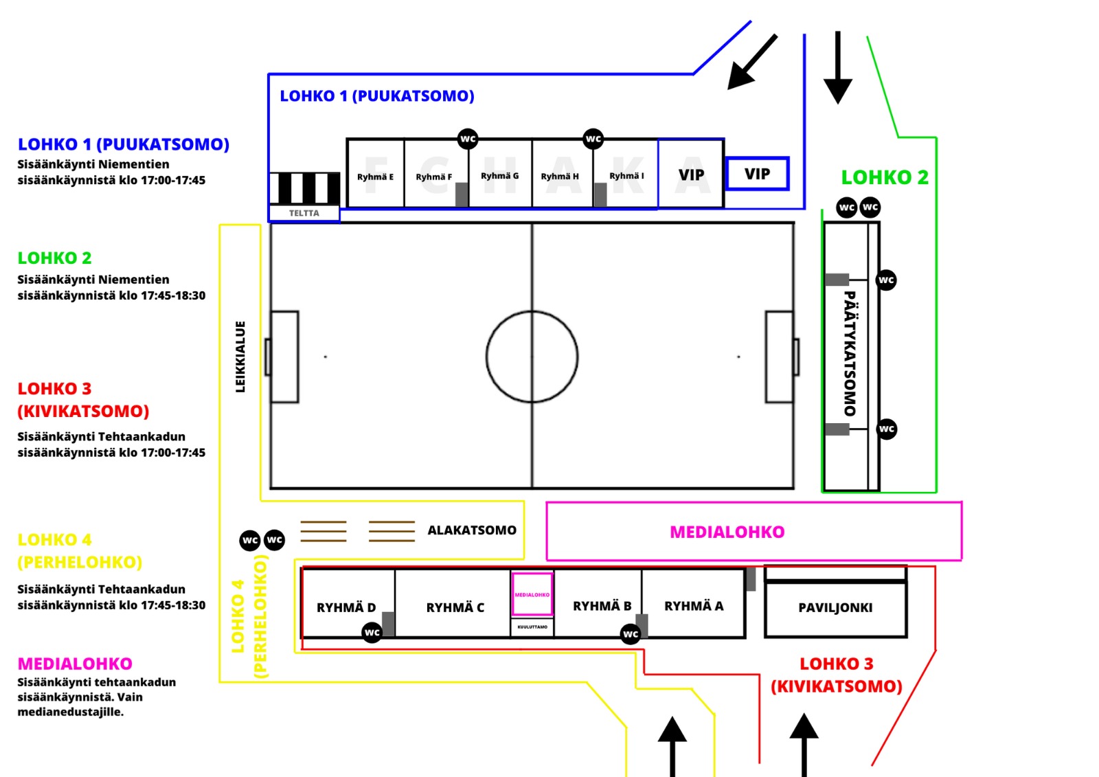 Yleisökapasiteettia on hivenen pystytty nostamaan lohkojaon uudistamisella. Tarkasta oheisesta kartasta uusi lohkojako, sekä kunkin lohkon sisäänpääsyaika. Lohkoja on kaikkiaan viisi kappaletta, mutta medialohkoon ei ole lippuja myynnissä ja sinne on pääsy vain median edustajilla, sekä henkilökunnalla.