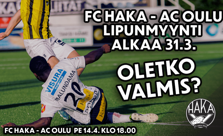 Kuumeisesti odotettu Veikkausliigan avaus on vihdoin täällä! FC Haka aloittaa keskiviikkona 5.4. liigarupeamansa vierasottelulla Seinäjoella SJK:ta vastaan. Ensimmäisestä kotiottelusta Tehtaan kentällä päästään nauttimaan perjantaina 14.4. klo 18.00 alkavassa ottelussa AC Oulua vastaan. Liput FC Haka – AC Oulu -otteluun tulevat myyntiin huomenna klo 12.00.