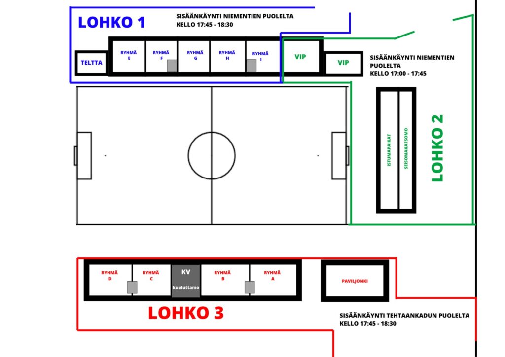 Lohko 2 (päätykatsomo + VIP) pääsevät ensimmäisenä sisään Niementien puoleiselta sisäänkäynniltä kello 17:00-17:45.