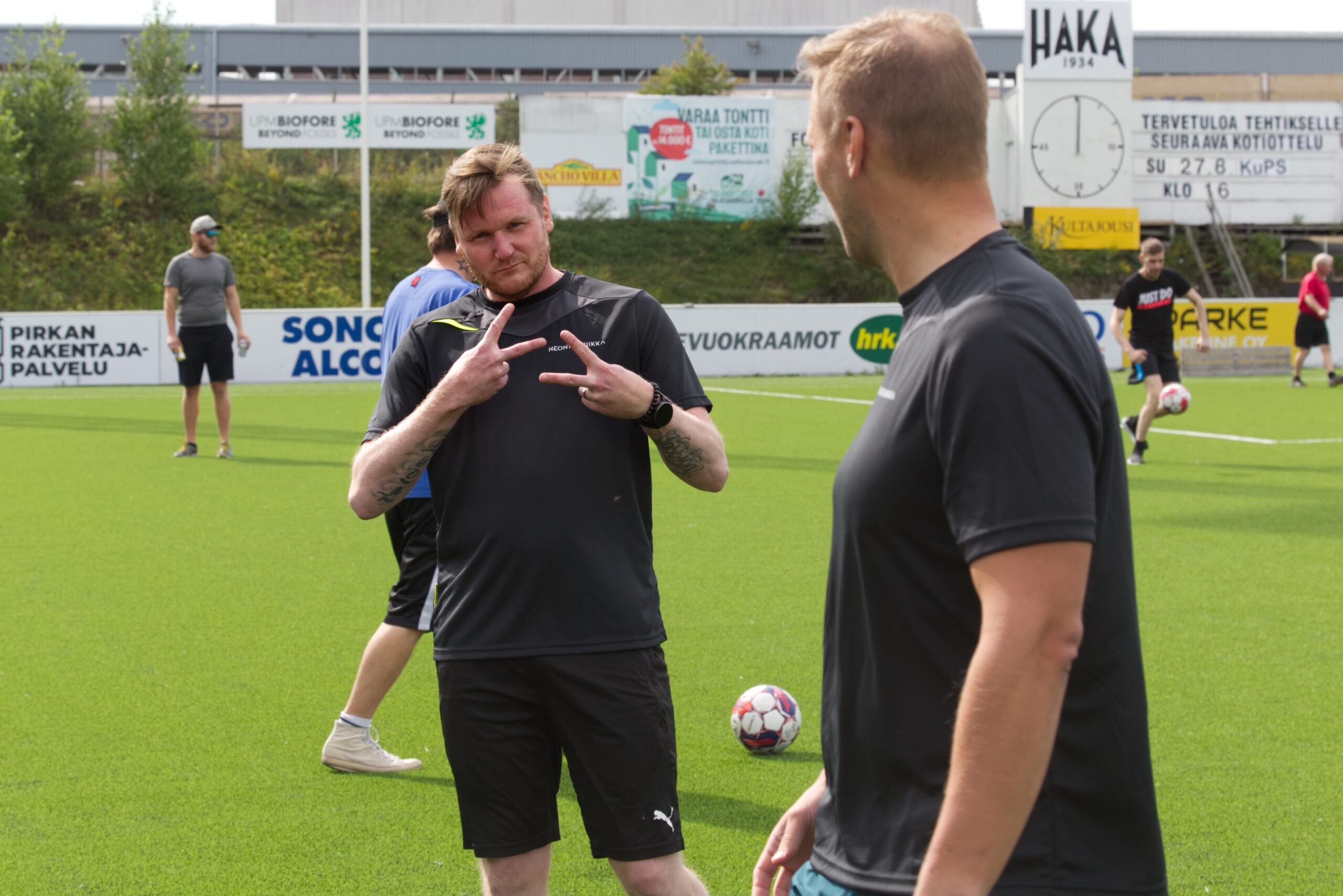 Kahvin ja luennon jälkeen oli aika vaihtaa urheiluvälineet päälle sekä siirtyä legendaarisen Tehtaan kentän nurmelle. FC Hakan pelaajista paikalla olivat Henri Malundama, sekä Tino Purme, jotka ensin vetivät Neontekniikan toiveiden mukaisesti MAS -testin. Kuntoilun jälkeen oli edessä kevyempää, pelureiden vetämää leikkimielistä kilpailua pallojen kera tottakai, sillä jalkapallokentällähän nyt oltiin.