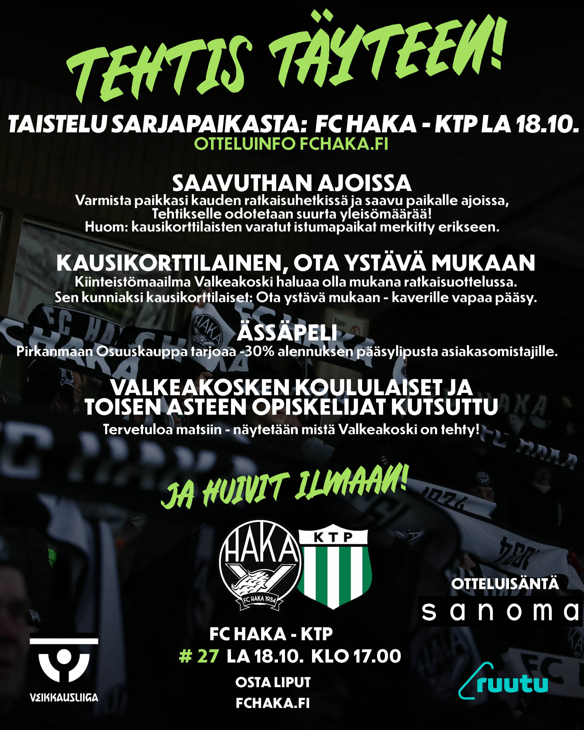 FC Haka – KTP, la 18.10. klo 17.00 (portit avautuvat 15.30). Otteluisäntä Valkeakosken Sanomat.