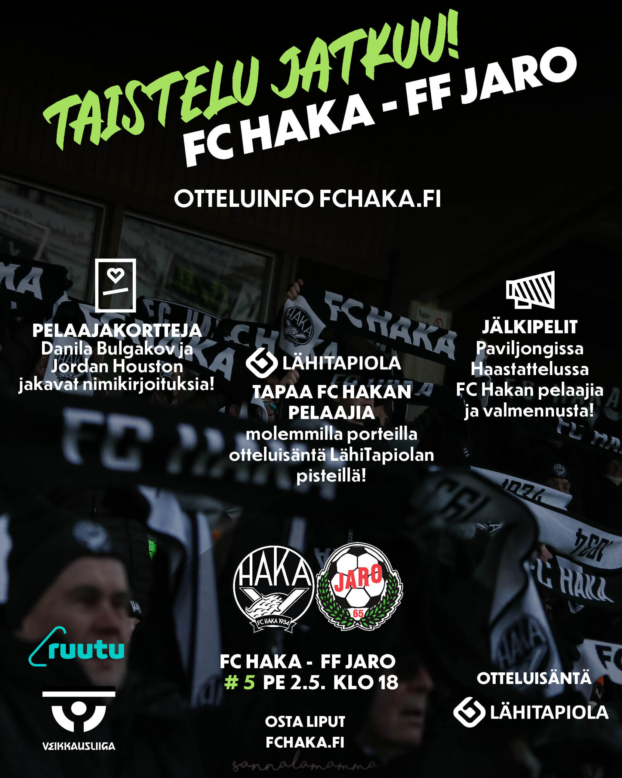 Tätä halua ja henkistä vahvuutta mitataan jälleen, kun Haka etenee kohti perjantain kotiottelua. Perjantaina on aika jälleen nostaa huivit ilmaan ja tehdä Tehtiksestä mustavalkoinen, kun vastaan saapuu nälkäinen liiganousija FF Jaro!