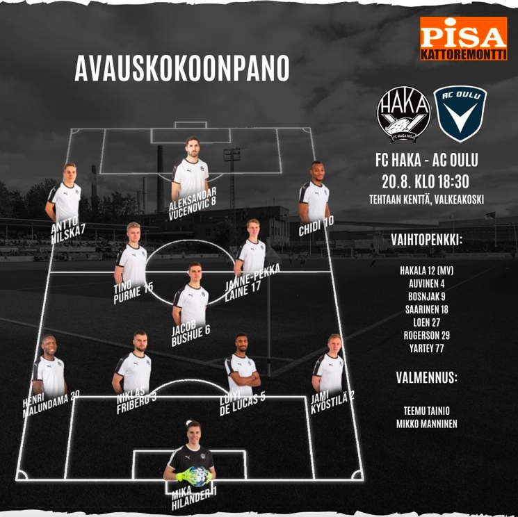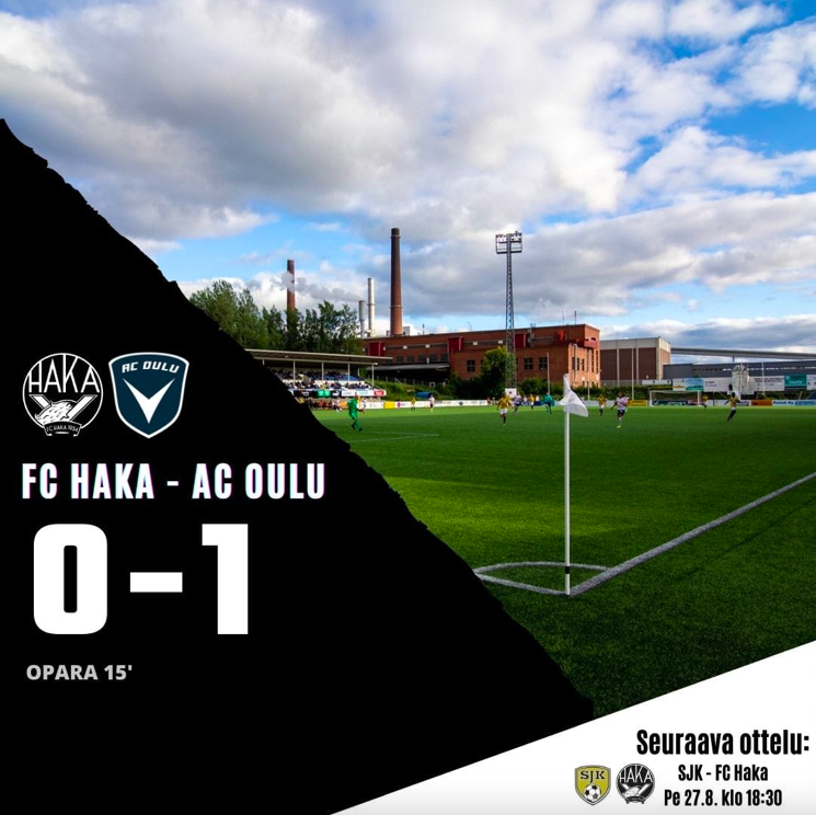 Tehtaankentällä kamppailtiin perjantai -illassa kahden hyvävireisen joukkueen kamppailu, mistä pisteet olisivat olleet molemmille äärimmäisen tärkeät. Ennen ottelua Hakaa kaksi pistettä perässä ollut AC Oulu onnistui avausjaksolla tekemään ottelun ainoan maalin ja veivät sillä täydet kolme pistettä mennessään.