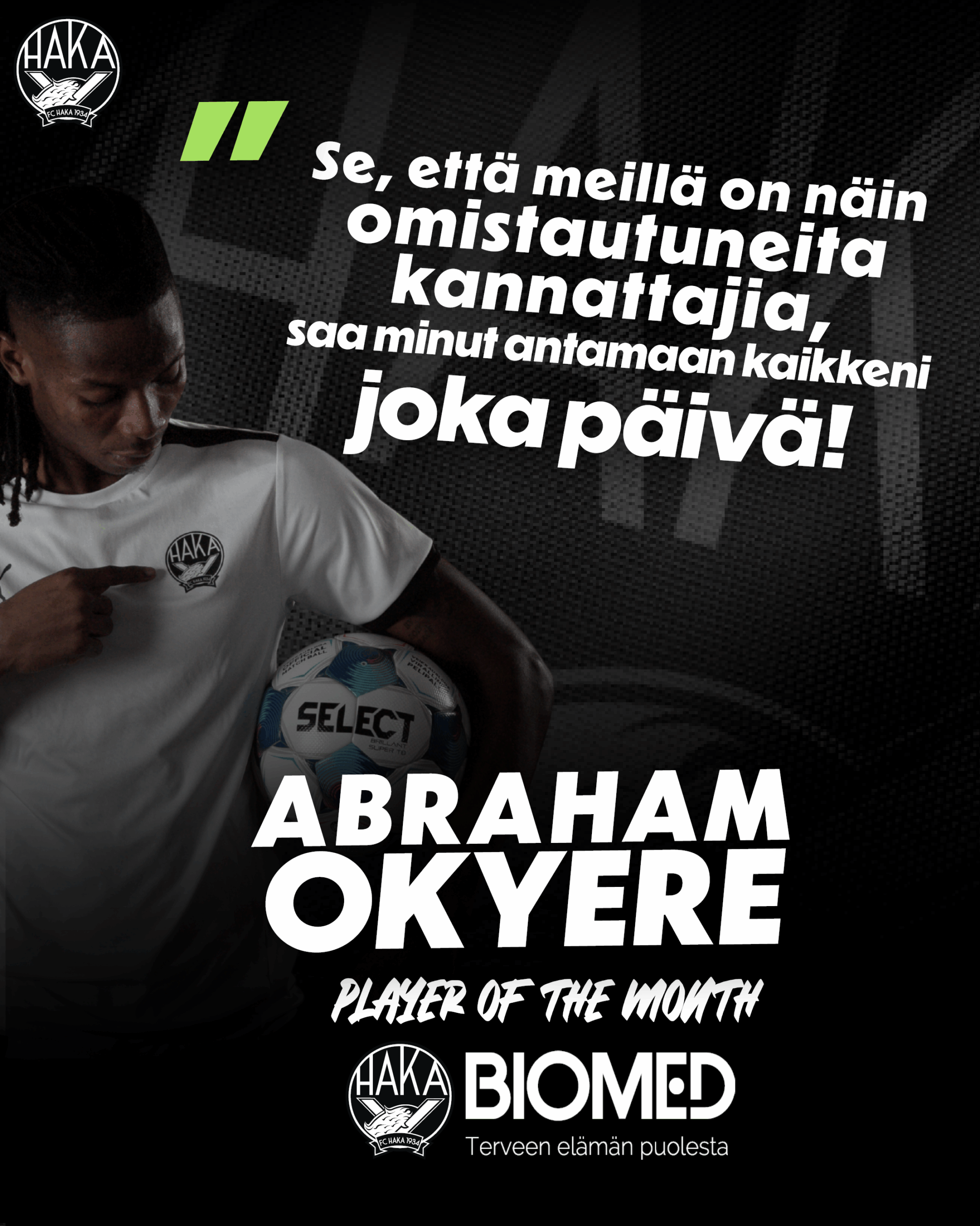 FC Hakan ja Biomedin syyskuun pelaajaksi on valittu keskikentän kova uurastaja Abraham Okyere, joka oli valinnastaan otettu ja antoi kiitoksena vahvat viestit Hakan kannattajille.