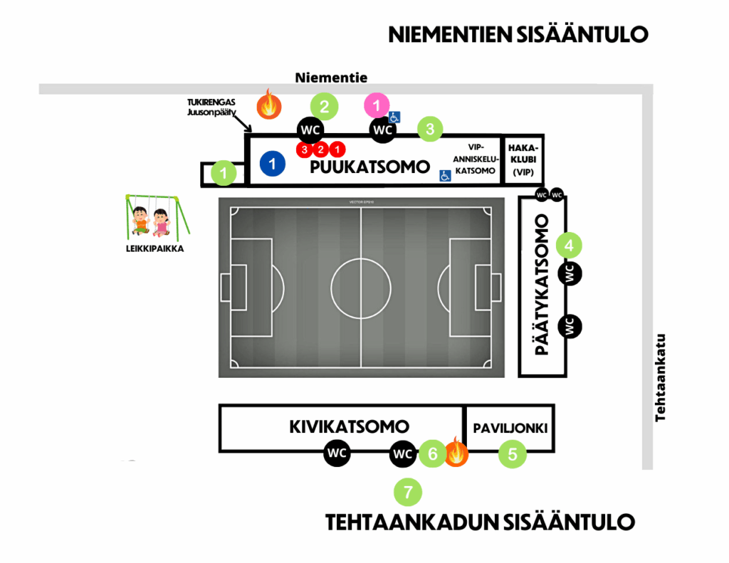 Istumapaikat ovat Tehtaan kentän katsomoissa numeroimattomia ja vapaasti käytettävissä lukuun ottamatta kausikorttilaisten koko kauden pysyviä istumapaikkavarauksia. Varatut istumapaikat on merkitty selkeästi VARATTU-merkinnällä.