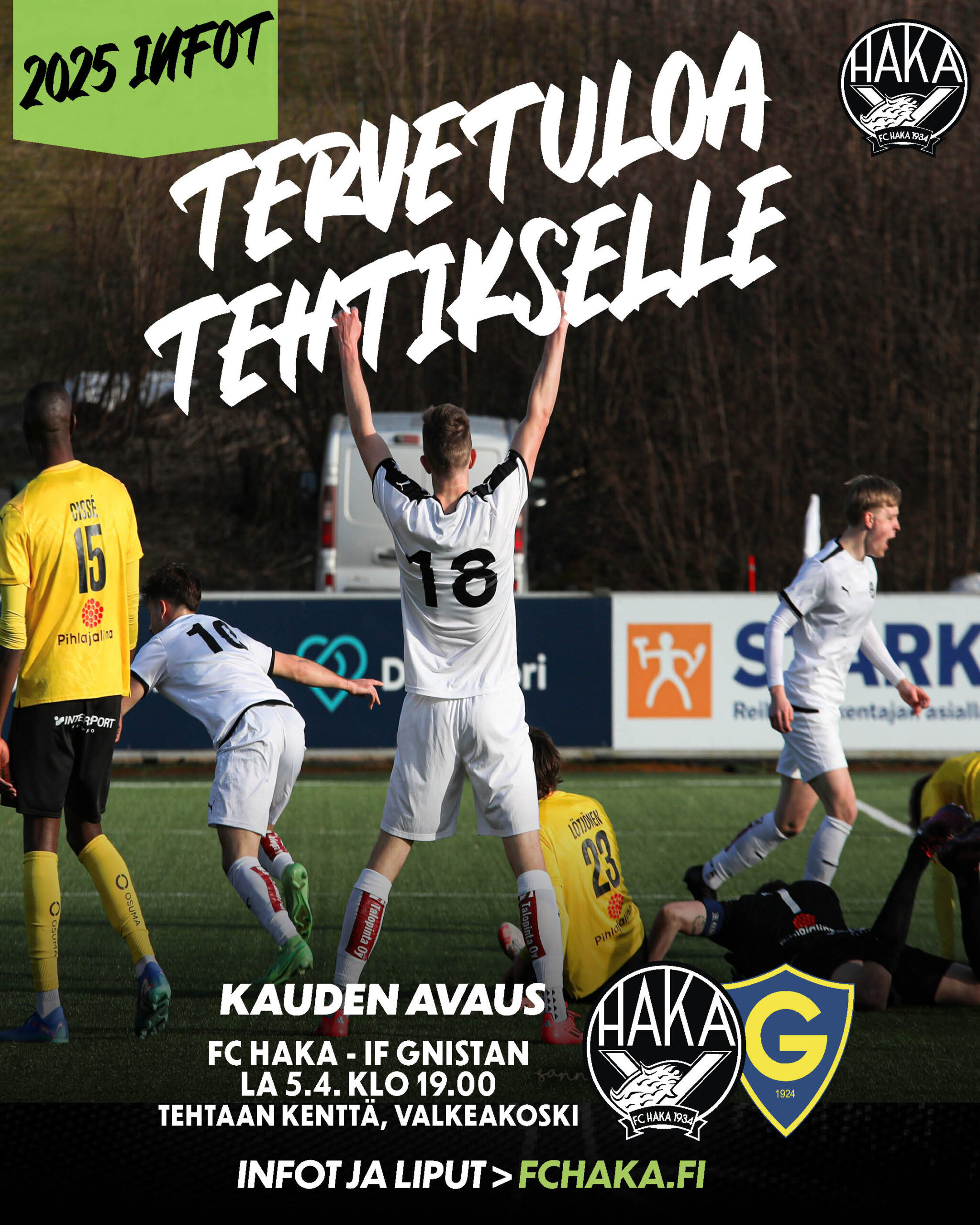 Veikkausliigakausi 2025 käynnistyy Tehtaan kentällä nyt lauantaina 5.4.! Avausottelu FC Haka – IF Gnistan pyörähtää käyntiin Tehtaan kentän iltavaloissa klo 19:00. Paikalle kannattaa tietenkin saapua jo hyvissä ajoin. Ravintola Paviljongin etkoilla esiintyy Mikko Huoviala klo 18 alkaen. Tekemistä ja tunnelmaa riittää. Portit alueelle aukeavat klo 17:30. Tervetuloa!