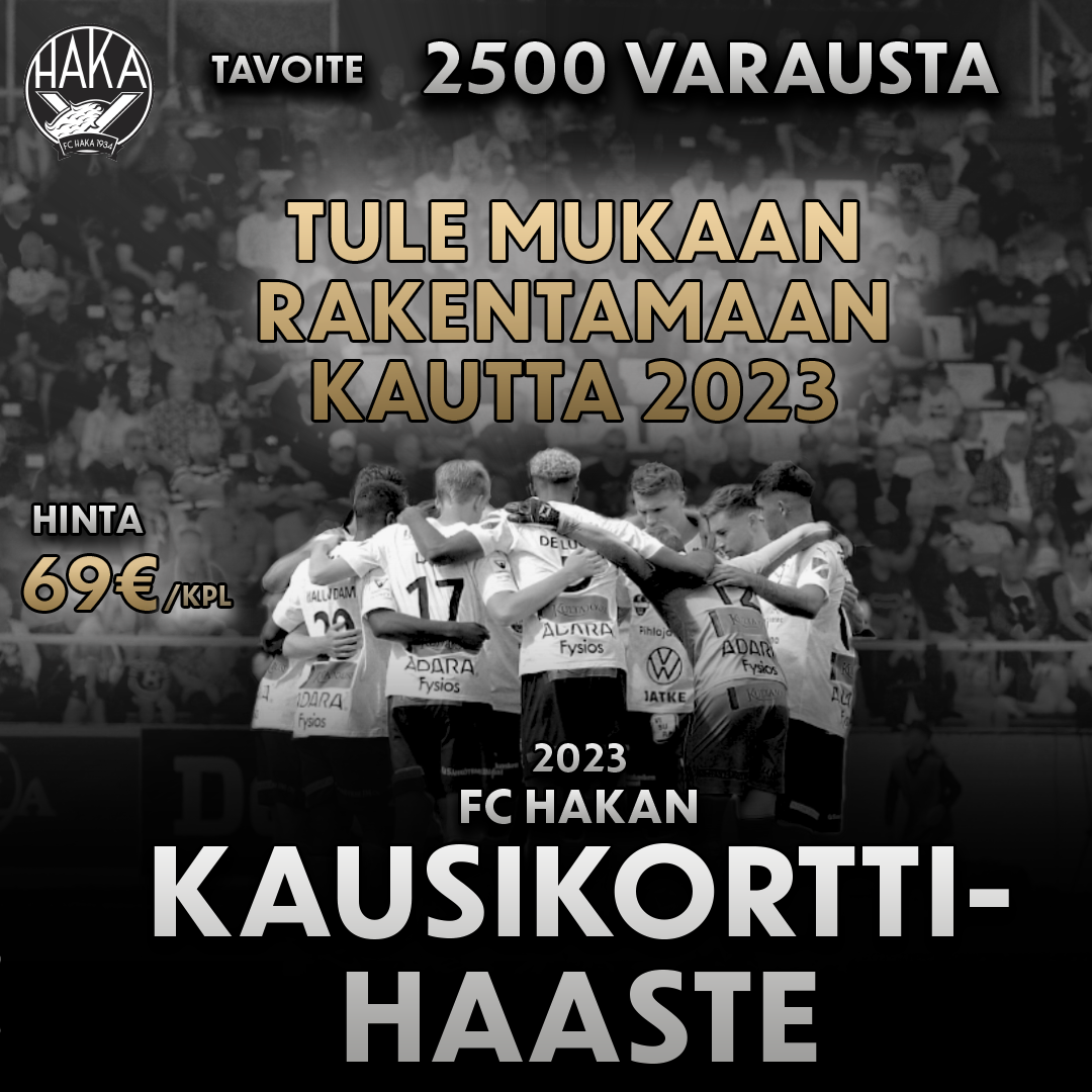 Kokonaisuudessaan upean kauden ja yleisömäärien merkittävän kasvun kunniaksi FC Hakan kausikortin Veikkausliigakaudelle 2023 saa vain 69 eurolla, kun kausikorttihaaste toteutuu. Osallistumalla haasteeseen on mahdollisuus tukea ensi kauden rakentamista uusia hankintoja tehdessä.