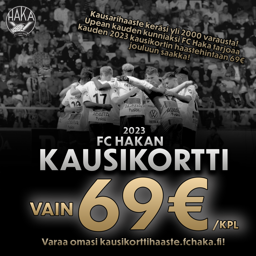 FC Hakan lokakuun ajan käynnissä ollut kausikorttihaaste 2023 toteutui erittäin myönteisesti, kun varauksia tuli yli 2000 kappaletta. Seura päätti huikean varauslukeman ja kokonaisuudessaan upean kauden kunniaksi haasteen toteutumisesta ja kausikorttien myymistä 69 euron hinnalla päätettiin jatkaa aina jouluun saakka. Kausikortilla saa myös -20% alennuksen FC Hakan 2023 Europelien kotiottelulippuihin.
