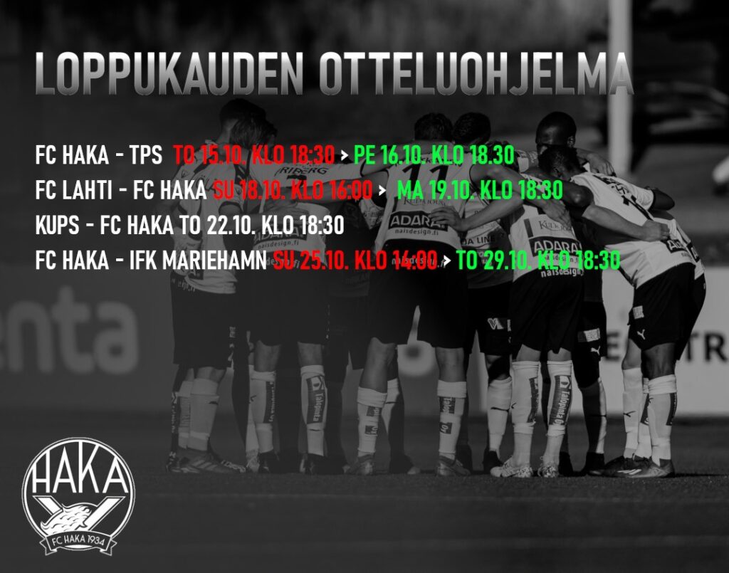 Veikkausliigan loppukauden otteluohjelmaan on tehty muutoksia, johtuen positiivisesta korona -tartunnasta Turun Palloseuran joukkueessa. FC Hakan ja TPS:n piti ottaa yhteen ensi viikon torstaina, mutta tämä ottelu siirtyy nyt päivällä eteenpäin. Myös muita otteluja on jouduttu siirtämään.