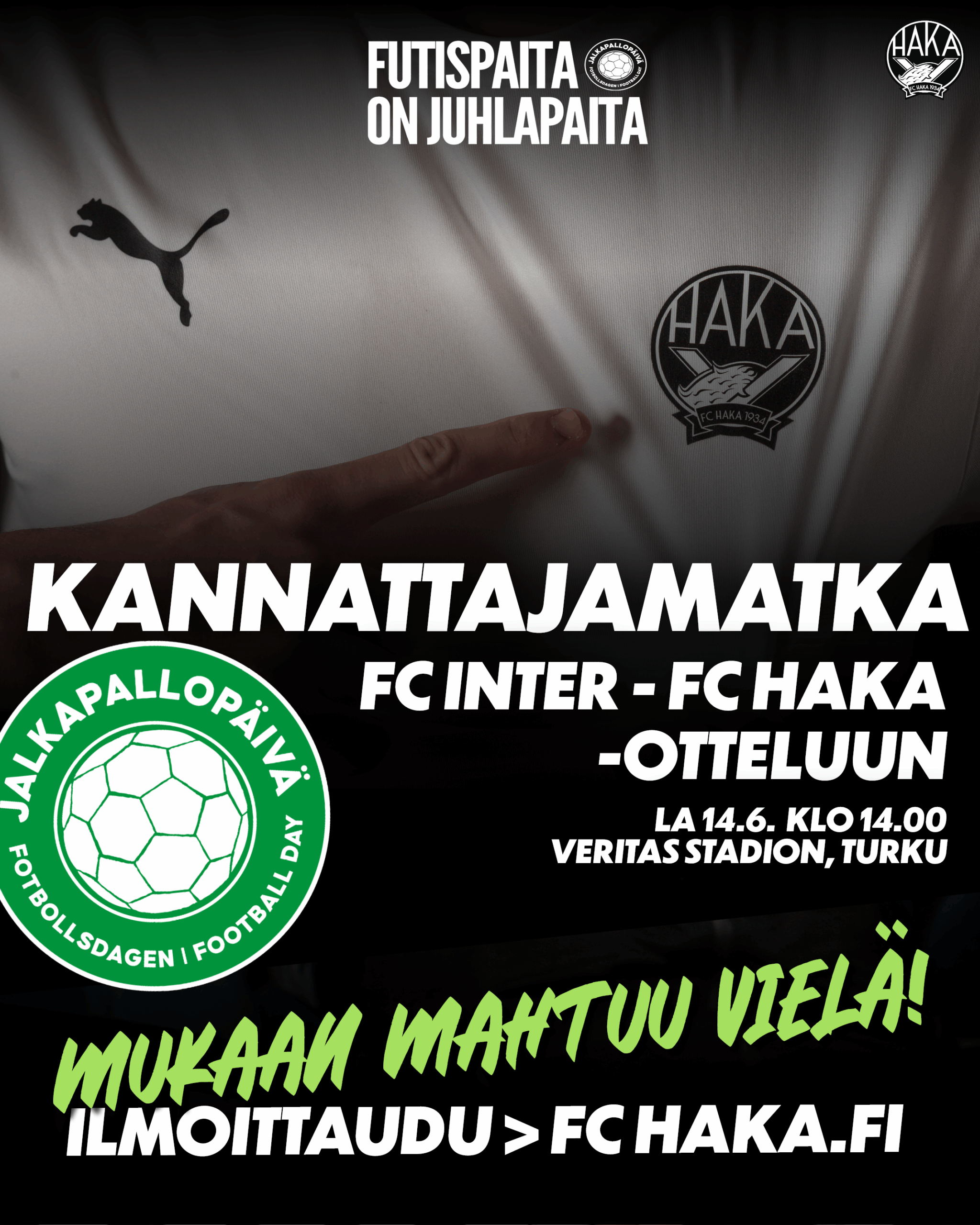 Hakan kannattajat ry järjestää kannattajamatkan ylihuomenna lauantaina 14.6. kello 14:00 Turussa pelattavaan FC Inter – FC Haka -otteluun. Matkan hinta on jäsenille 20€ ja muille 25€. Matka toteutuu, ja mukaan mahtuu vielä! Vietä Jalkapallopäivää parhaimmalla tavalla, eli paikan päällä!